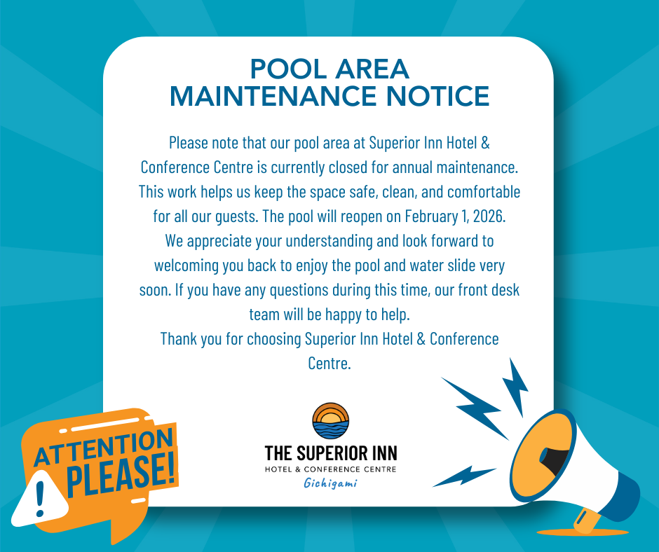 The Superior Inn Hotel & Conference Centre Amenities The Superior Inn Thunder Bay hotel has 182 guest rooms featuring all the amenities that you have come to expect including: • Pillow-top mattresses • Premium bedding • Complimentary wireless high-speed Internet in all guest rooms • 40” LCD television • Complimentary local and toll-free calls • Coffee maker with complimentary coffee/tea • Mini fridge • Complimentary parking during guest stay • Microwave • The Fitness Centre is open from 6:00 a.m. to 10:00 p.m. daily Accessibility For more information about the physical features of our accessible rooms, Accessible Areas with Accessible Routes from Public Entrance • Fitness Center • Meeting spaces and ballrooms • Public entrance alternative • Registration desk • Restaurant / Lounge